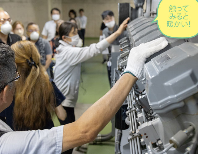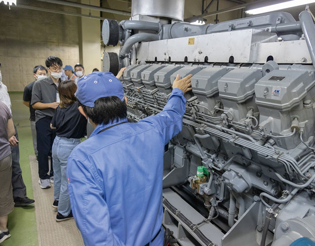 停電に備えて設置されている非常用発電設備は、船舶規模のディーゼルエンジンを使用。すぐに起動できるようにプレヒーティングされています。
