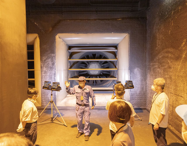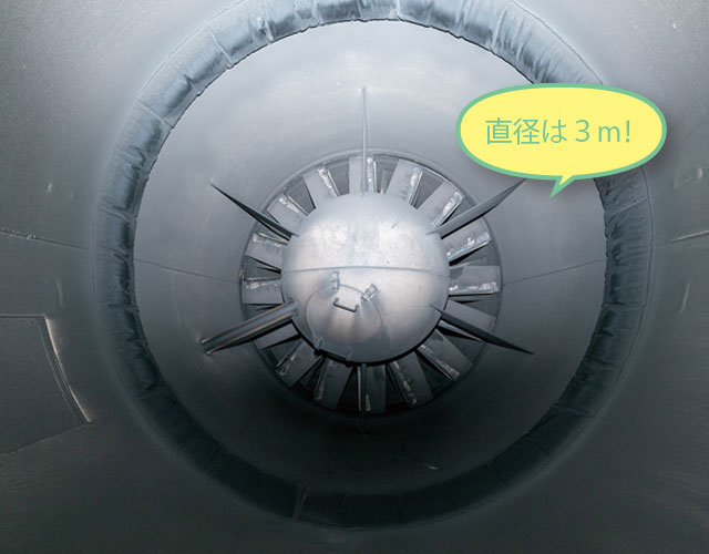 電気集じん機できれいになった空気を吸い込んで、換気塔の上部へ送り出す巨大な扇風機。
