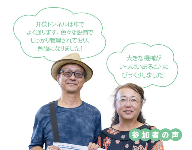 今回で3回目の開催となった「環八 井荻トンネル見学ツアー」、「環2 築地虎ノ門トンネル見学ツアー」では、実際にトンネルの現場を見ていただくことで、安全で快適な通行のためには、日々の業務がいかに重要であるかをご理解いただく機会になったものと思っております。今後も都民の皆様にご満足いただけるツアーを企画し、安全に楽しく実施していく予定です。