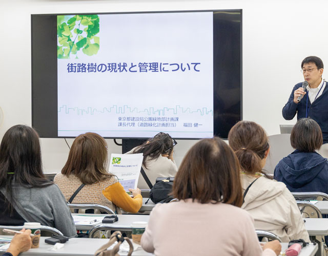 東京都建設局公園緑地部の職員から東京都の街路樹の役割と維持管理についての説明。