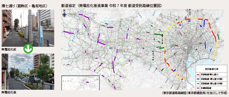 公社は、区市町村と連携して無電柱化エリアの面的拡大を推進することにより事業効果を高めるため、平成18年度から各自治体が実施する無電柱化事業の業務受託を開始しました。また、平成19年度から東京都が推進する無電柱化事業の業務受託を開始しました。東京都では、東京都無電柱化計画が令和3年6月に改定され、第一次緊急輸送道路のうち環状七号線の整備及び整備済区間との連続性、環状七号線内側エリアと主要駅周辺における整備済の都道・国道・区市町村道との連続性を考慮した路線の整備を進めています。公社では、それらの路線を受託して事業を進めており、令和7年度は、都道において、69箇所、整備延長約161.0km、区市道において、4区2市から7箇所、整備延長約5.3kmの無電柱化事業を推進し、高度防災都市の実現に貢献しています。(令和7年9月時点)