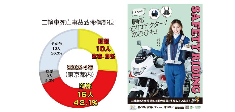 二輪車死亡事故の多くは、胸部と頭部に致命傷を負っています。速度を控え、交通ルールを守り、ヘルメットのあごひもは正しく締めてください。そして、万が一の事故に備えて胸部プロテクターをつけましょう。ライダーの皆さん、自分の身を守る安全装備、真剣に考えてみませんか?