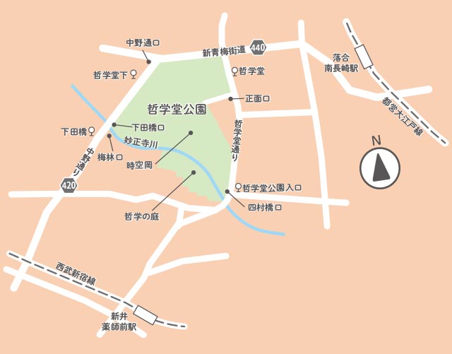 ④JR中野駅北口から「江古田の森(関東バス)」行きまたは「南蔵院経由練馬駅(京王バス)」行き「哲学堂下」下車徒歩約1分