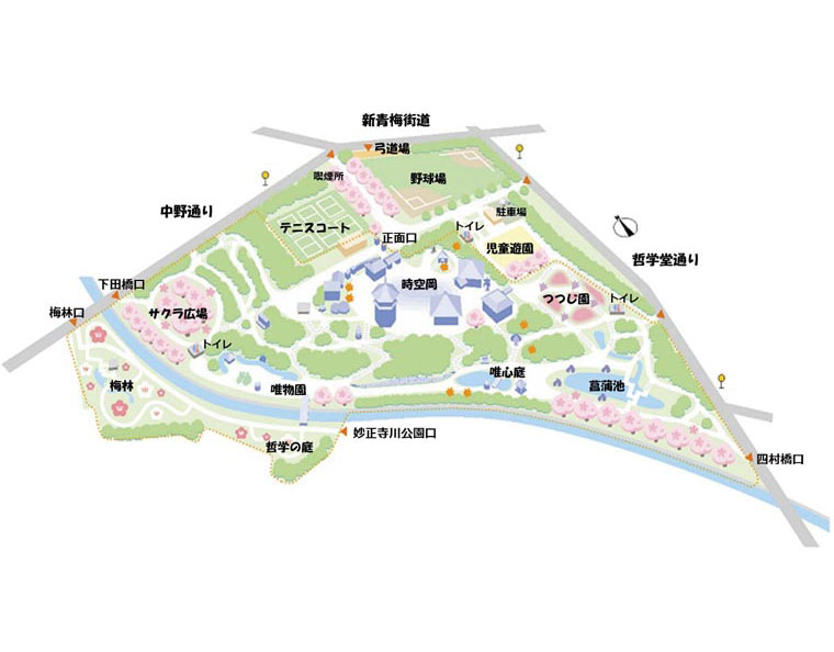 哲学堂公園の地は、かつての野方村大字江古田字東和田。土地の伝説によると源頼朝が平家討伐の軍を率い房総から武蔵に入った時、重臣・和田義盛がこの地に陣所を置いたことから「和田山」と呼ばれるようになったとのことです。公園は明治37年(1904)に、哲学館(現東洋大学)の創立者で妖怪博士と呼ばれた哲学者・井上円了博士によって、哲学を中心とした精神修養の場として創設。昭和21年(1946)に都立公園に、昭和50年(1975)に中野区に移管され「中野区哲学堂公園」となりました。園内には哲学の概念を建築物、石造、池や道などで表現し、それぞれに哲学に由来する個性的な名前がつけられた七十七場(ななじゅうななば)があります。園内の小高い丘の標高は約14m。平成21年(2009)に哲学堂公園の一部が東京都指定名勝となり、令和2年(2020)には風致景観や学術的価値等が評価され、哲学堂公園の全域が国の名勝に指定されました。また都内有数の花の名所であり、四季折々の風情を楽しめます。井上円了博士の遺した建築物群をぜひ鑑賞してみてください。