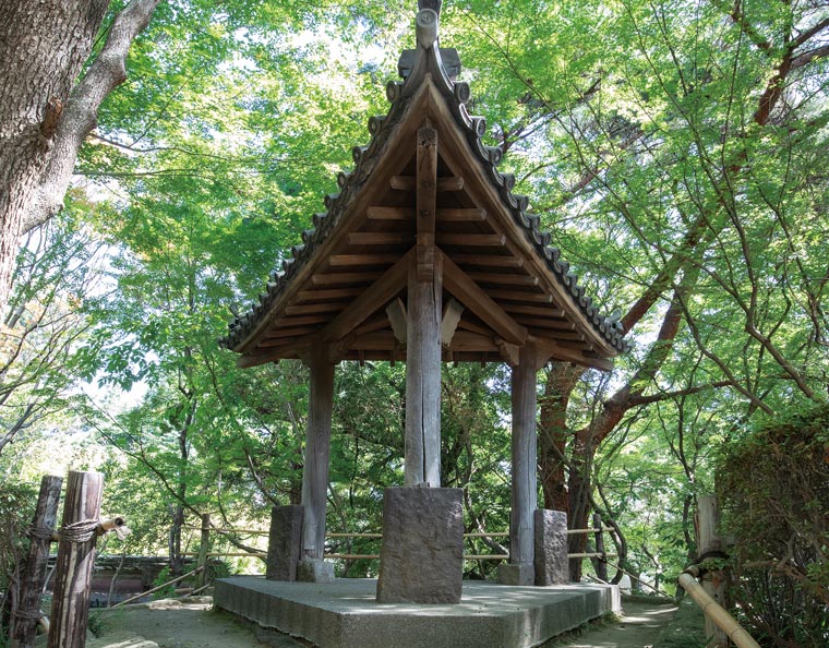 三角錐の築山の頂上に三本の柱で支えられた三學亭