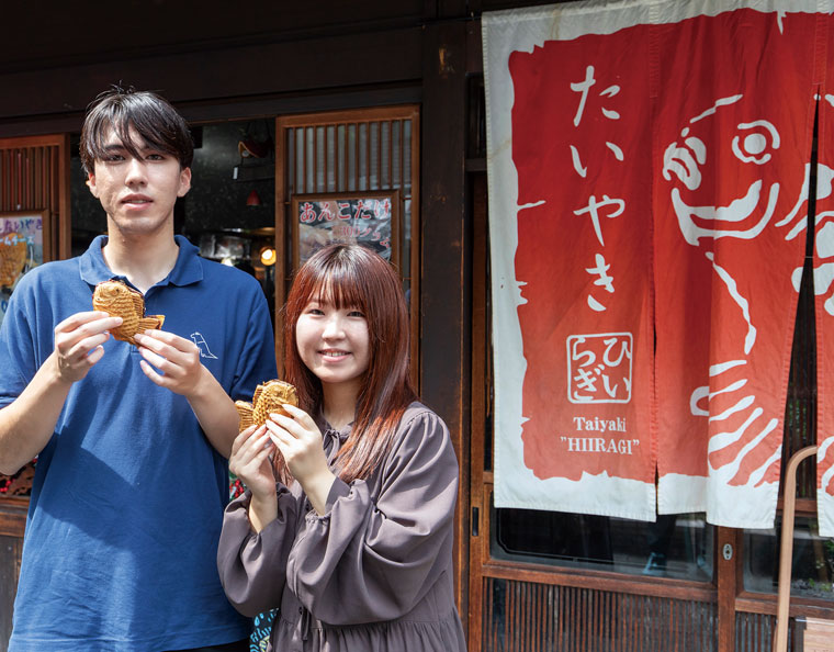 裏路地にひっそり佇む老舗たいやき店「ひいらぎ」。約30分かけてじっくりと焼き上げるたいやきは、パリパリの香ばしい皮の中に自家製の餡がたっぷり。スイーツ好きも大絶賛するたいやきは、焼きたてはもちろん冷めても美味しさはそのまま。遠方からもこの味を求めてたくさんの人が訪れます。