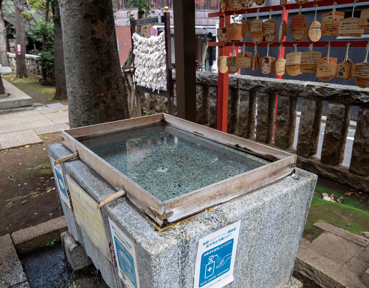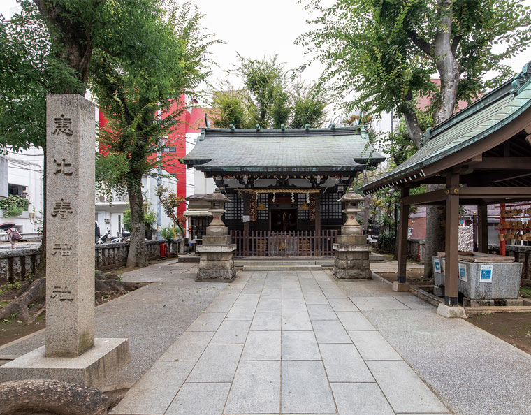 JR恵比寿駅近くの市街地に鎮座する恵比寿神社は、商売繁盛、家内安全、無病息災、五穀豊穣に御利益があるといわれています。旧名は天津(あまつ)神社で、戦後の区画整理で駅前から遷座した時に、恵比寿の町名やヱビスビールにあやかって兵庫県の西宮神社から恵比寿大神を勧請して合祀し、恵比寿神社に改名されました。小さな神社ですが、商売繁盛を願って恵比寿界隈で働く人だけでなく、区外からも多くの人々が訪れます。御朱印は恵比寿商店街会館にあります。