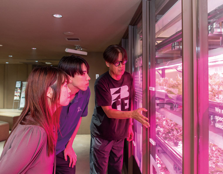 照度を調整しながらレタスやルッコラなどの野菜を育てています。収穫したての新鮮な野菜は、2Fのカフェで使われ、美味しくいただくことができます。