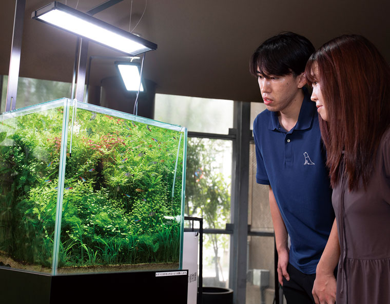 水の中の植物園として、魚などの小さな生き物と植物が共生する様子を見ることができます。