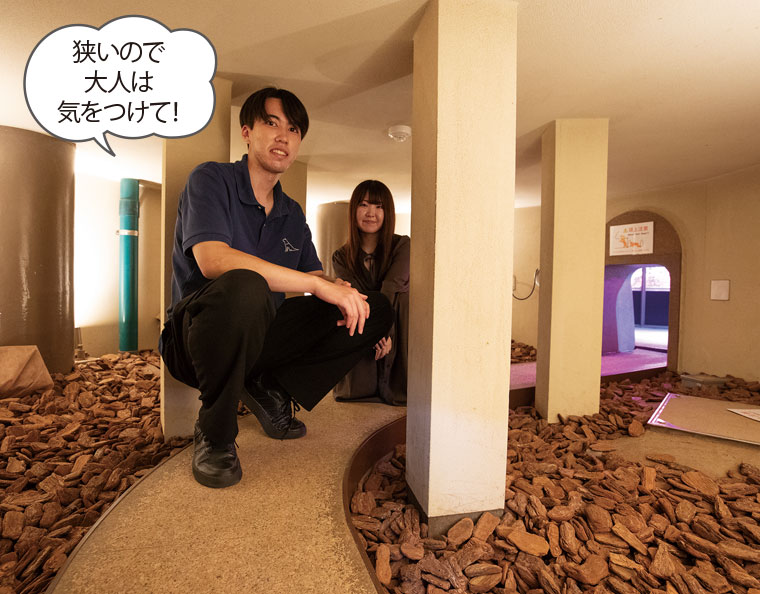 大きなキノコのような形の下のほうに、小さな穴が空いていて、反対側まで小径がつながっています。穴を見つけた子どもたちが、何度も出入りできる遊び心に富んだ仕掛けになっています。