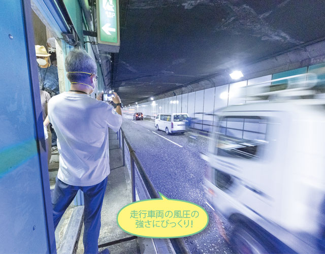 非常口扉から井荻トンネル内の車道を覗き、間近に走行する車両を見学