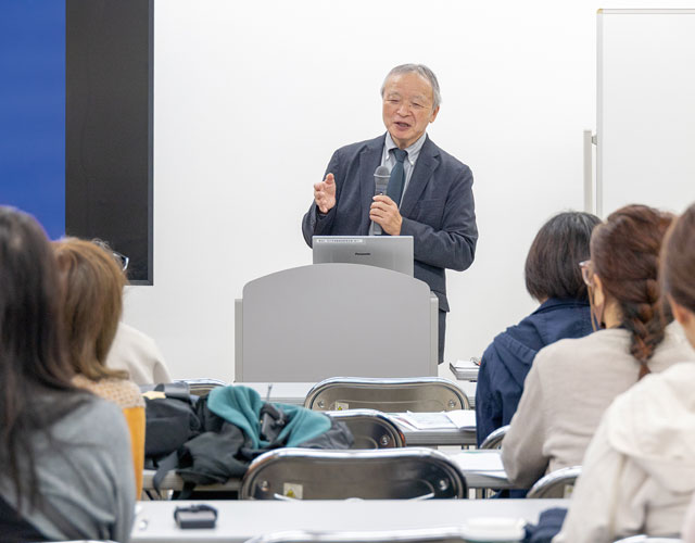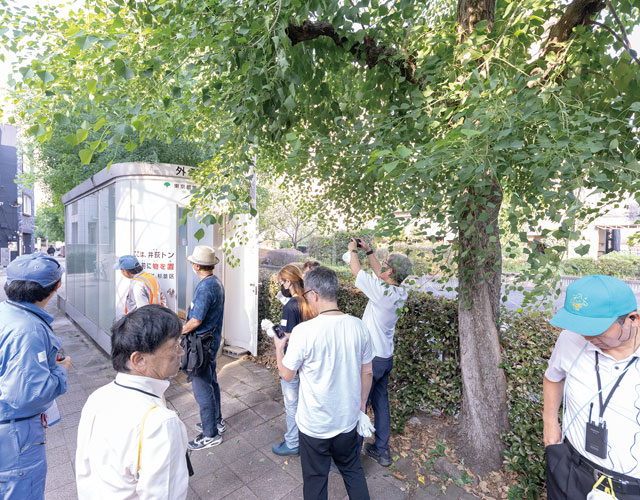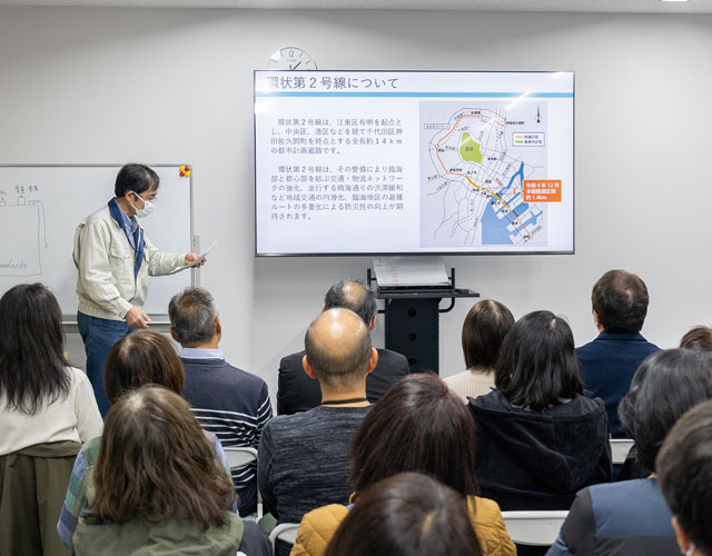 東京都建設局公園緑地部の職員から東京都の街路樹の役割と維持管理についての説明。