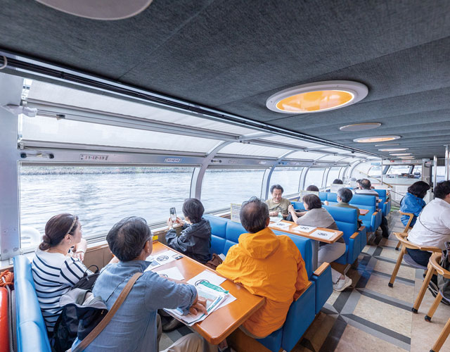 船内では東京都建設局道路管理部職員から隅田川に架かる橋の特徴や歴史の説明を受けました。