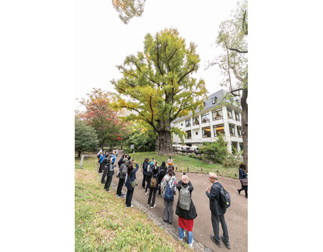 松本楼前の首賭けイチョウ。公園開設まで日比谷見付(現・日比谷交差点)付近にあったものを公園の設計者・本多静六博士が「私の首を賭けても移植を」と、今の場所に移動したことからこの名で呼ばれるようになりました。