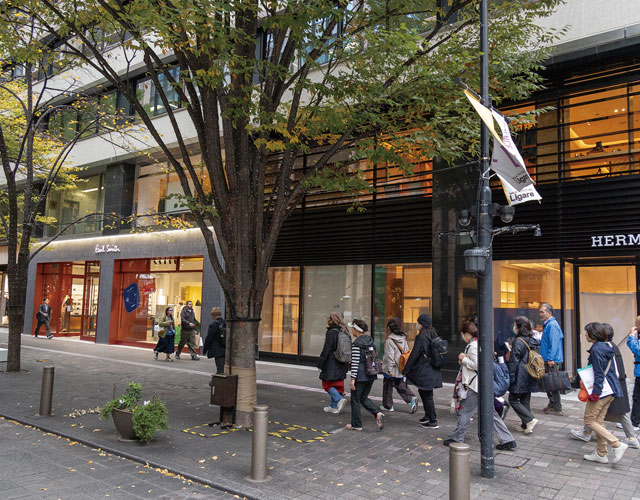 車道を減らして歩道を広くした丸の内仲通りは、ケヤキなどが植えられています。