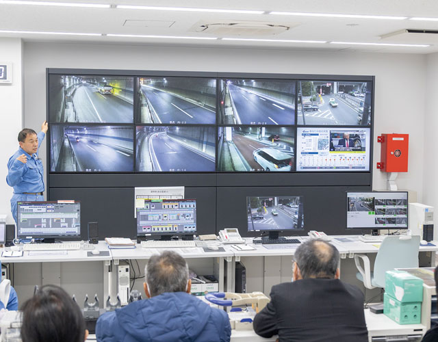 トンネル内の情報をCCTVモニター等により24時間体制で監視する監視室。モニターごとに区間を決めて、監視するカメラは順次切り替えられています。