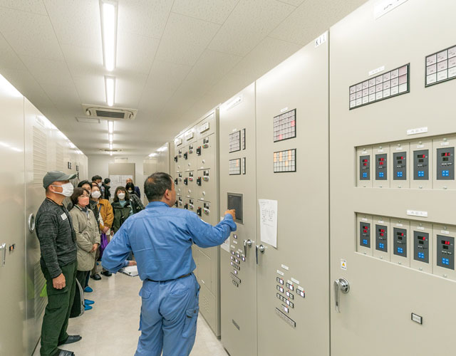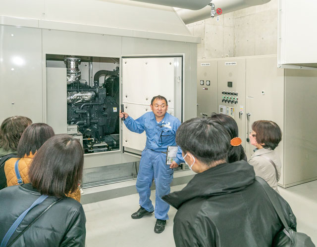 電力会社からの電力供給が停止した場合、重要な施設へ電気を送るディーゼル発電機。一般住宅なら100軒分を賄える500kVAで、少なくとも24時間運転できる能力があります。