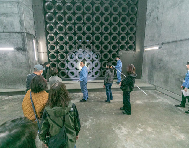 たくさんの除じんフィルターが並べられた除じん装置。トンネル内を走行する車の排気ガスは除じん装置でろ過され、排風機、消音装置、換気塔を通って、きれいな空気となって外へと排出されます。