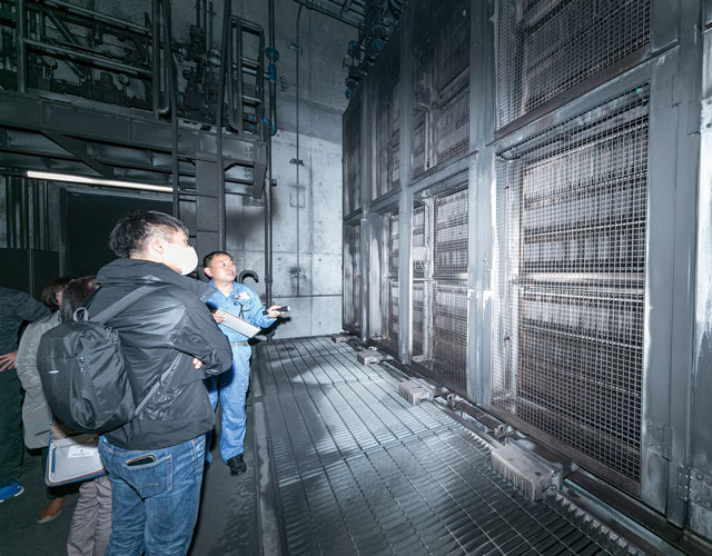 地下2階から非常時に使用する避難通路を通り、地上にある非常口を見学